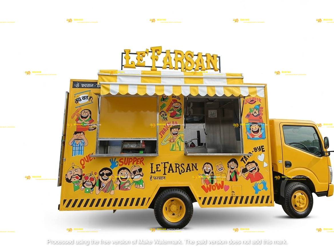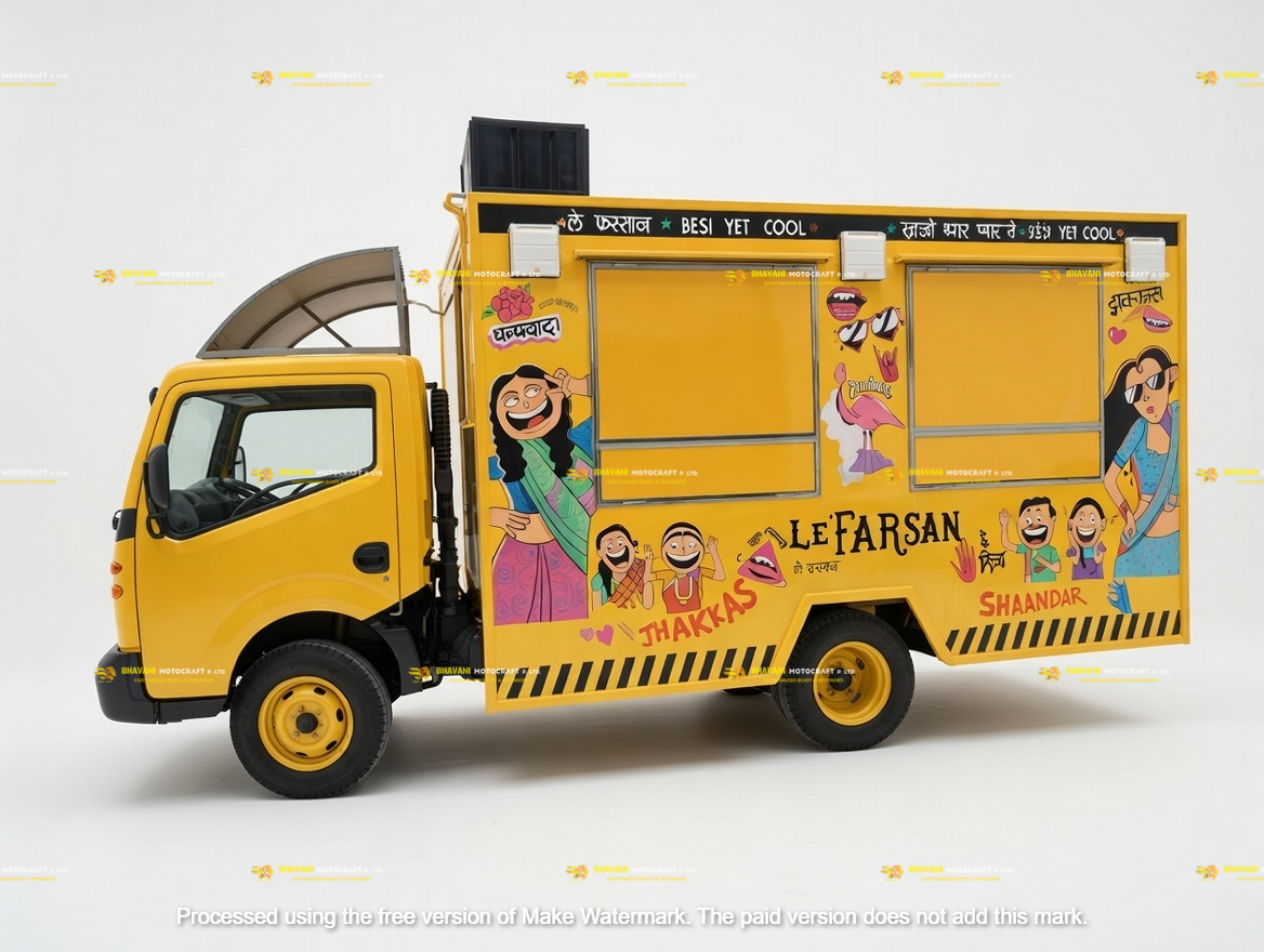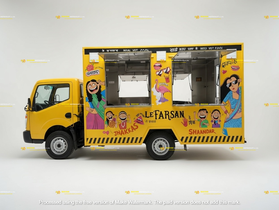Mobile kitchen container body designed for towing and temporary setup at food parks, campsites, and campuses.